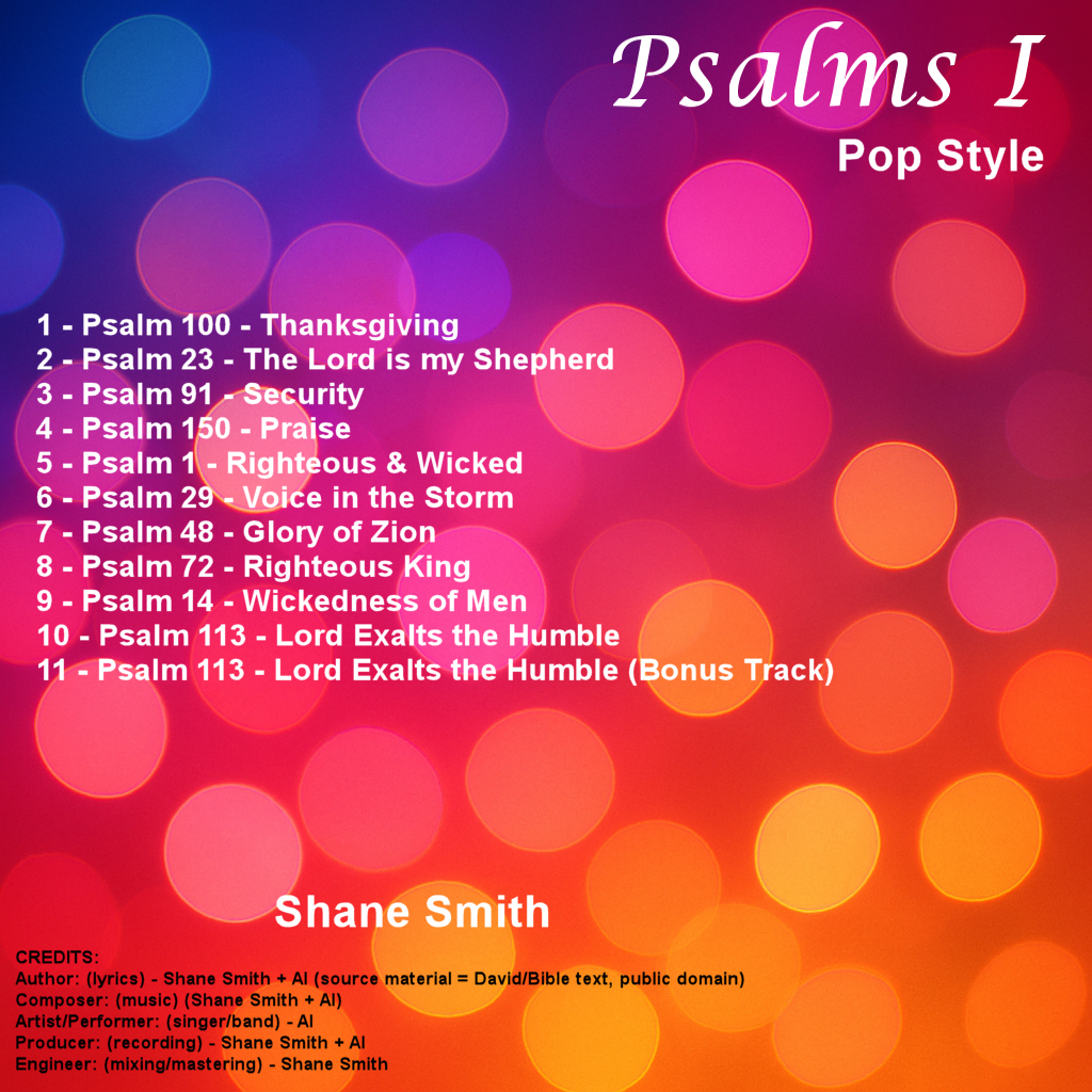 Psalms I – Pop Style by Shane Smith – A groundbreaking collection of biblical Psalms transformed into contemporary pop anthems. Featuring dance-worthy beats, soaring melodies, and the pure voices of a choir, this album brings ancient scripture to life with electric guitars, infectious rhythms, and arena-ready production. From the blessed meditations of Psalm 1 to the thunderous celebration of Psalm 113, each track honors the original text while delivering fresh, energetic worship experiences that resonate with modern audiences.